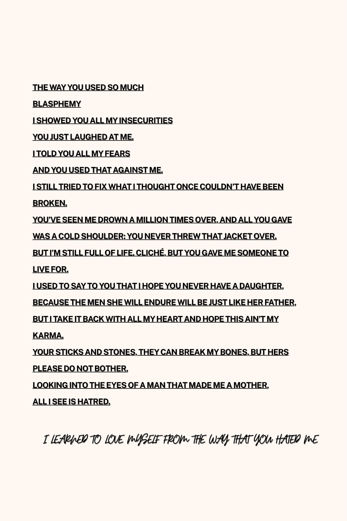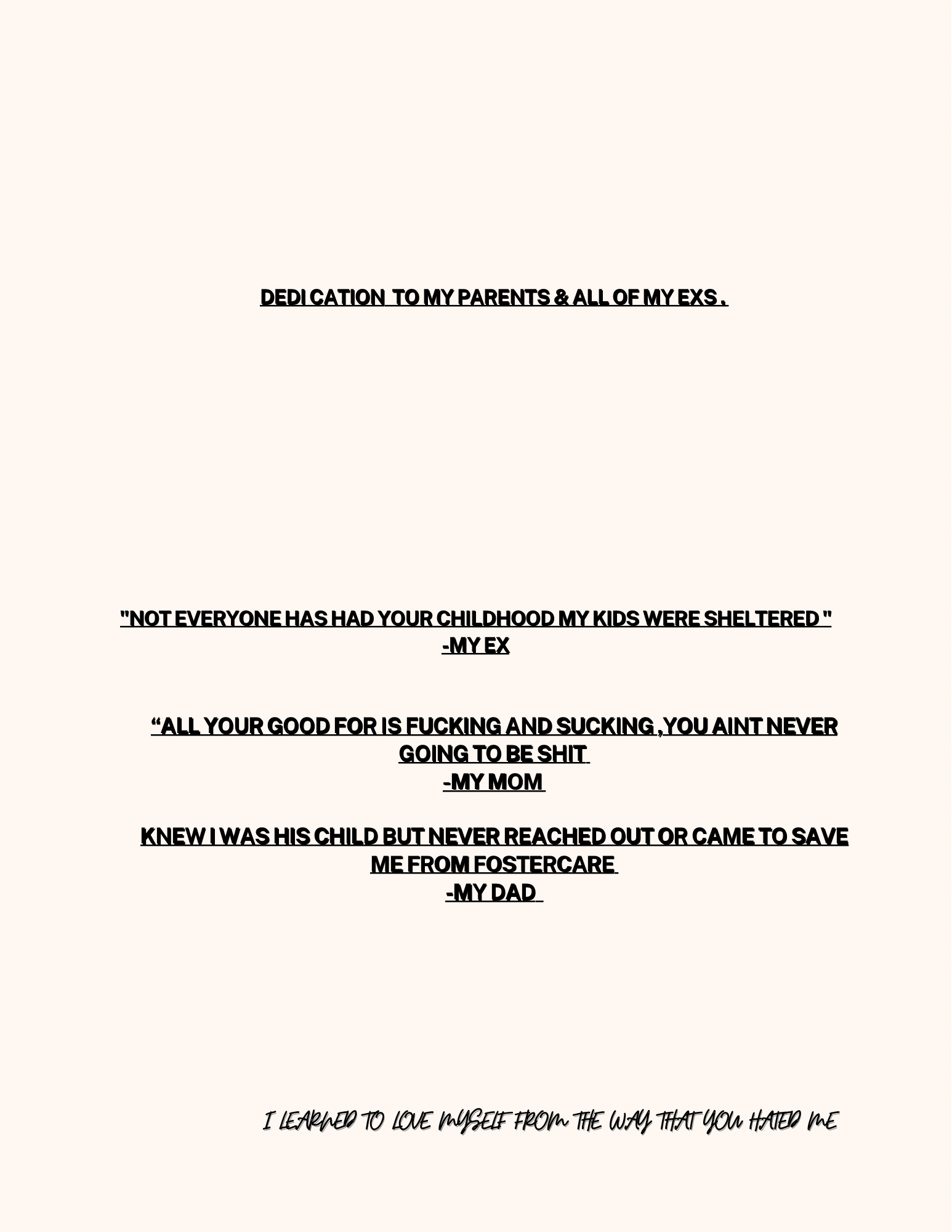 January 4th in the middle of winter , My mother gave birth to me in the bathroom and put me in a trash bag , threw me in the abandoned house next door through a cracked window and left . My father disowned me and never sought out to get me . A girl with a fucked up past , abandonment & daddy issues with a whole lot to say . I chose all the wrong people to love while getting nothing but lessons in return .